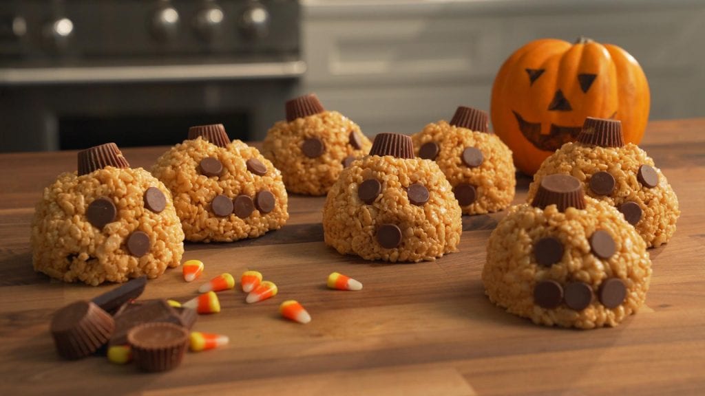These treats will be the perfect snacks on your Halloween table. They’re simply the traditional Rice Krispies Treats rolled into balls and given chocolate chip “faces.” So much easier than carving a pumpkin—no risk of lopping off a finger either.