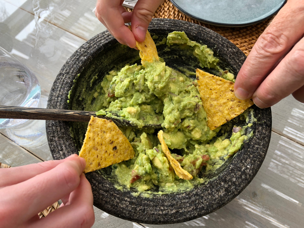 Here’s how to quench your guacamole craving without overdoing it. Keep the serving size to a realistic half cup. Limit yourself by placing the nachos or veggies on the plate and not diving into the bag. When the sides and the guac are done, so is snack time!
