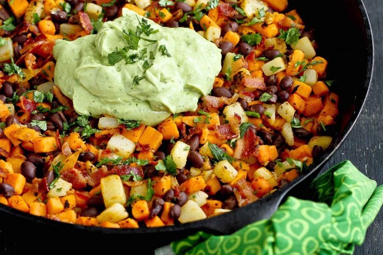 Dice and boil ¾ pounds of russet with 1 ¼ pounds of sweet potatoes, then cook in a skillet with olive oil, garlic, salt, cilantro, and black beans.