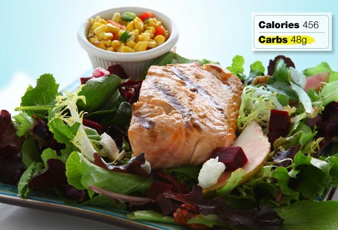 A super meal for people with diabetes, or anyone else, begins with grilled or baked fish. A grilled corn salsa and a beet, pear, and walnut salad round out the meal. The total carbs don’t go overboard (48 grams), and there’s a good balance of other key nutrients: protein, fiber, and fat.