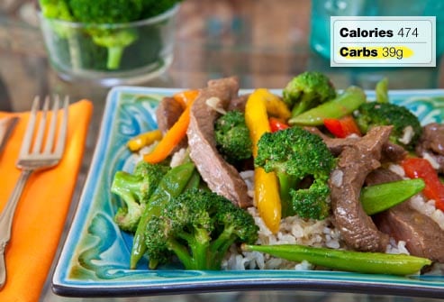 Make your own beef and broccoli stir-fry meal, so you can choose a lean cut of beef and low-sodium soy sauce. Skip the greasy noodles and fried rice — both options are full of carbs, calories, and fat. Load up on stir-fried veggies instead. Choose steamed instead of fried pot stickers to shave fat calories. For even less sodium, skip the soy sauce.