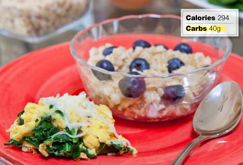 This quick meal delivers protein in a scrambled egg, and just 40 carbs, mostly from fiber-rich oatmeal and blueberries. Fiber slows digestion to help prevent blood sugar spikes. People with diabetes need to watch all types of carbs: cereal, bread, rice, pasta, starchy veggies, sweets, fruit, milk, and yogurt. Spread your total carbs across the day.