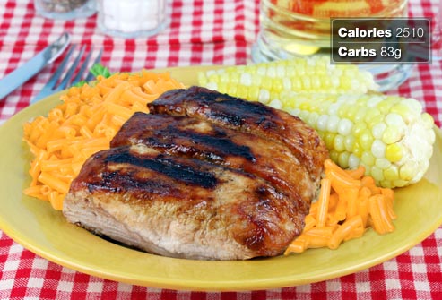 This classic Southern meal loads too many splurge foods onto one plate. Fatty pork ribs are dripping in sugary barbecue sauce and flanked by macaroni and cheese and corn on the cob. Corn is a high-carb vegetable, with about 19 grams of carbs in one medium ear. It’s just too much, all around.