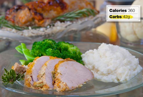 Pork tenderloin is one of the leanest and most versatile cuts of meat. Here it’s prepared in a Dijon mustard glaze, and served with steamed broccoli and mock mashed potatoes. Pureed cauliflower stands in beautifully for carb-heavy white potatoes. Round out the meal with a whole wheat dinner roll.