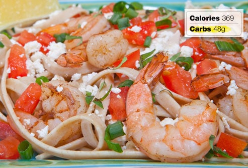 Low-fat shrimp and juicy, ripe tomatoes make this pasta dish a winner for everyone. Feta cheese has a tangy flavor with one-third less fat than hard cheese. Try pasta that is made of 50% to 100% whole grain to add the benefits of fiber: better blood sugar control and more satisfaction.