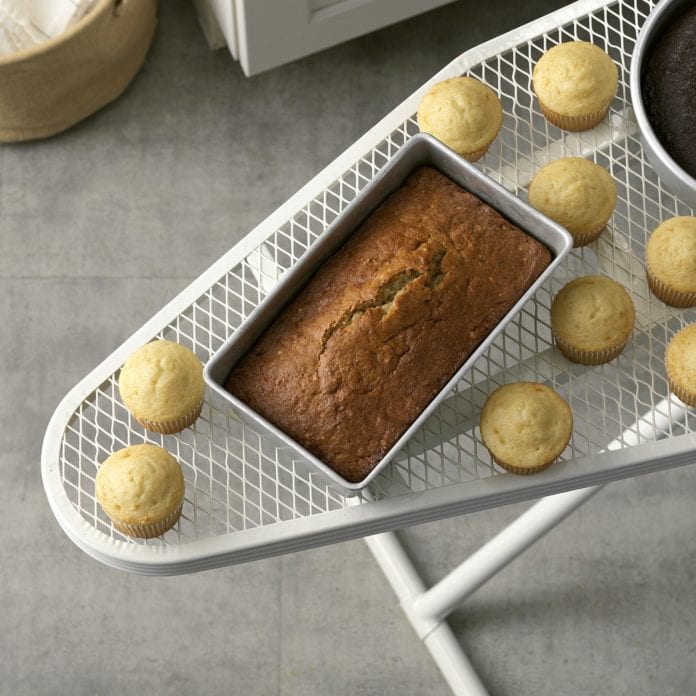 The ironing board is your new kitchen BFF. It can be used as extra counter space or even a makeshift cooling rack after you remove the cover.