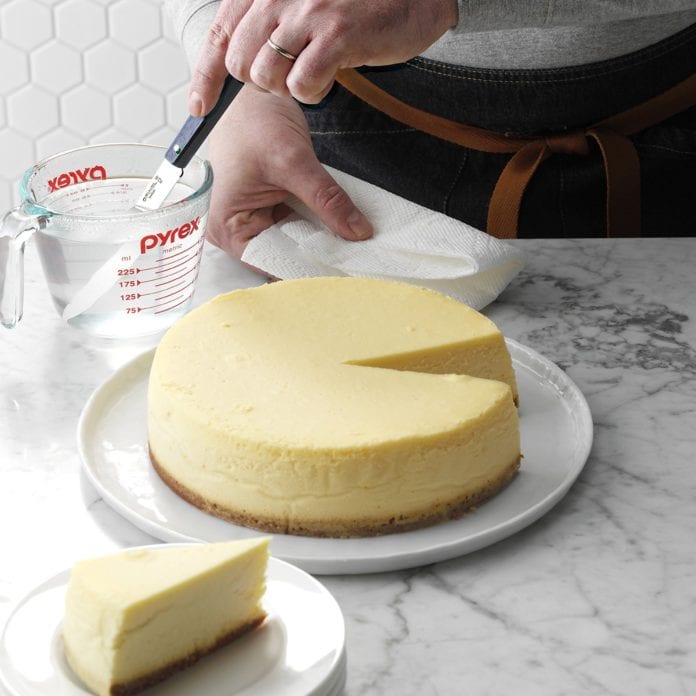 Dip the blade of your sharp knife in hot water to heat it up. Then wipe with a dry towel and cut your cake or cheesecake into nice, tidy slices. Repeat each time for pretty slices with a clean edge.