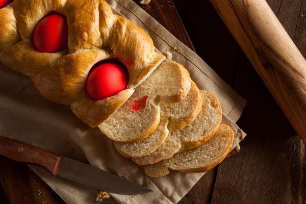 Made of braided strands of dough, tsoureki is a sweet bread served in Greece. It is often flavored with two traditional Greek spices: mahlepi (made from the seeds of wild cherries) and mastic (resin from the mastic tree). Shaped either into a circle or into two large braids, it is decorated with red-dyed Easter eggs.