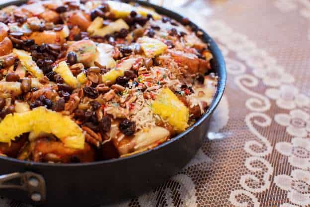 Capirotada is a Mexican bread pudding made with nuts, fruits, spices and aged cheese. Eaten throughout the month of Lent, its ingredients have a rich symbolism. The bread is meant to represent the body of Christ, the cloves signify the nails on the cross and the cinnamon sticks denote the wooden cross.