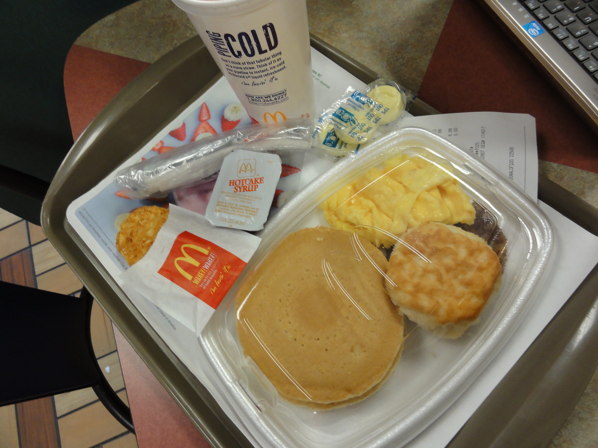 A Big Breakfast with Hotcakes at McDonald’s has 5 grams over your recommended daily saturated fat allowance and enough calories to cover breakfast, lunch, and dinner.