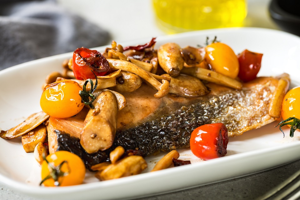 - Dinner—Salmon with mushrooms and roasted root vegetables.