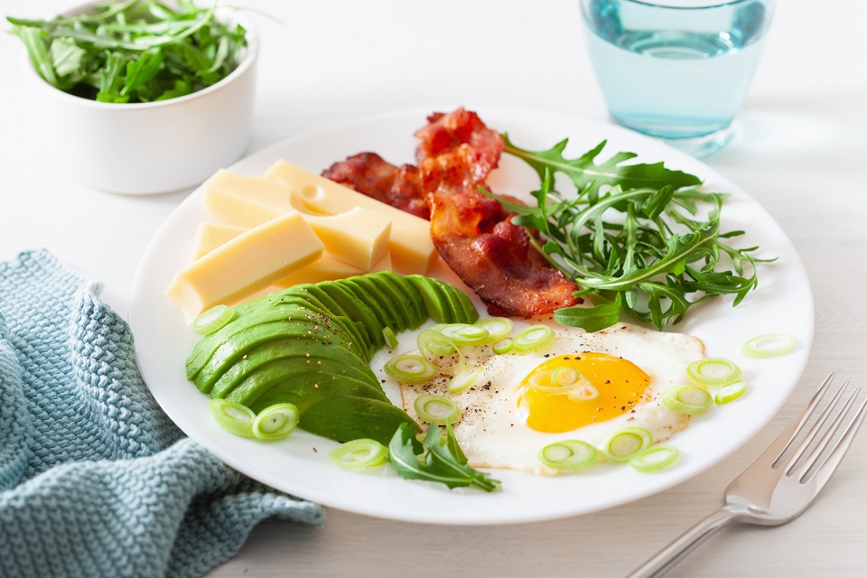 - Breakfast—Eggs cooked in butter with bacon and avocado.