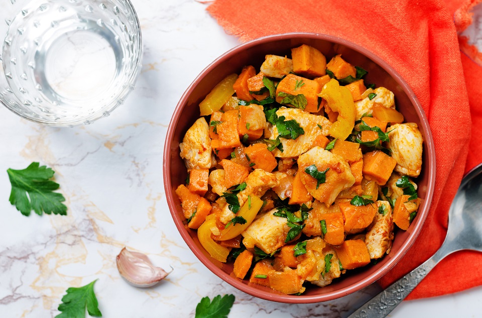 - Lunch—Organic chicken thighs with a baked sweet potato and vegetables.