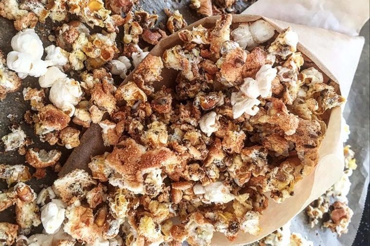 Directions: Preheat oven to 350°F. In a medium-sized bowl, beat egg whites and a pinch of salt until foamy, then add in sugar and beat until well-incorporated (but don’t overmix). Fold the popcorn through the whites along with the spices and place into the oven on baking sheet for around 40 minutes.