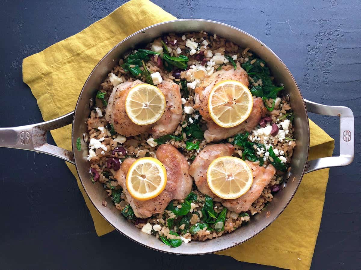 Lemon, fresh oregano, feta cheese, and Kalamata olives lend loads of Greek flair to this whole-grain rice skillet, brightening the flavor of earthy brown rice. Meaty chicken thighs brown on the stovetop then finish atop the rice mixture in the oven while all the flavors meld.