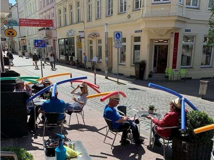 A German café, called Café & Konditorei Rothe in Mecklenburg-Vorpommern, Germany, has created pool noddle hats for their clients so that they can keep the social distance.Â
