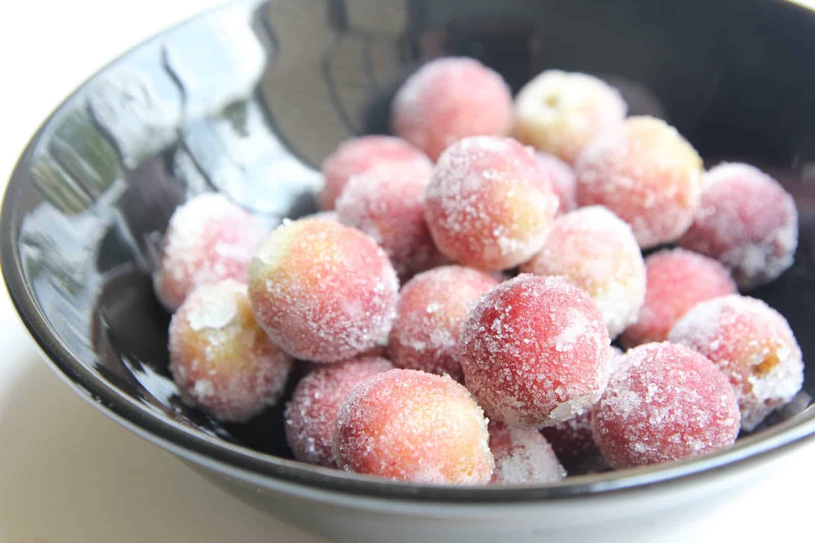Sometimes the simplest ideas are the most delicious. Frozen grapes end up having a very slushy texture. You can freeze them in an air-tight container or sandwich bag. Bananas should be sliced and laid out flat on a cookie sheet lined with wax paper, then transferred to an airtight container once they’re frozen. One small banana or 17 grapes will give you 60 calories and 15 grams of carbs.