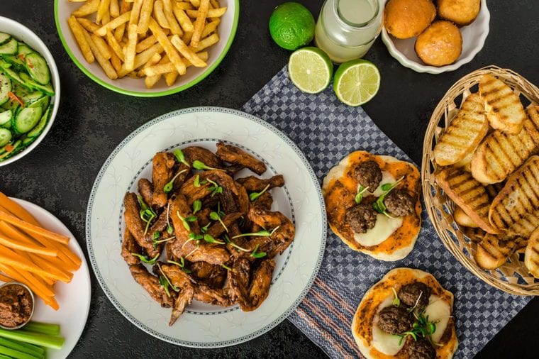 If you gather your friends for a party – this means a lot of sitting and eating, up to 2,400 calories, says Deborah Malkoff-Cohen, RD, a certified diabetes educator in New York City. “My key recommendations are to never go to any party starving or you will overeat everything,” she advises. She recommends having a small meal that’s heavy on protein, like eggs or tuna fish, before the party starts. “It will digest slower and keep your stomach full to help curb those cravings when the wings show up.”